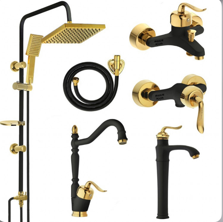 ست ۶ تکه شیرآلات مشکی طلایی قاجاری بامبو + روشویی بلند و علم دوش و شلنگ* *ارسال رایکان