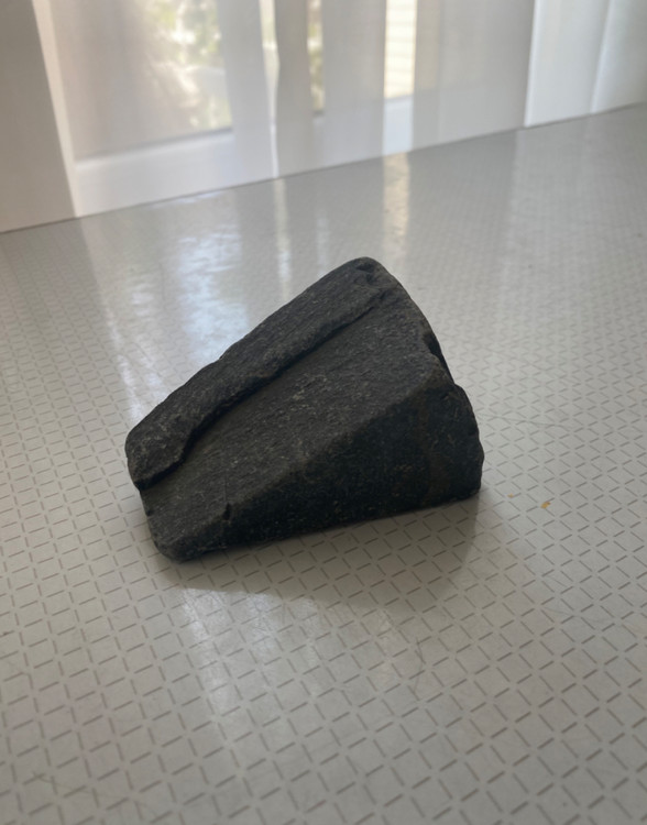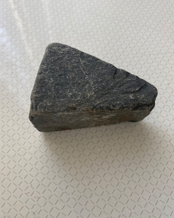 رنگ سنگ خاکستری-طوسی یکنواخت با بافت دانهریز و طبیعی. این سنگ از نوع دگرگونی (احتمالاً اسلیت یا هورنفلس) است که بهطور طبیعی تحت فشار و دمای بالا شکل گرفته.