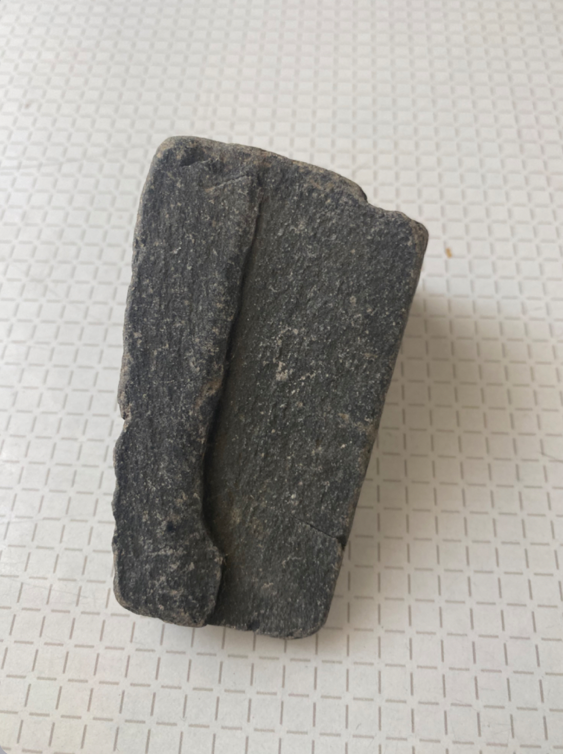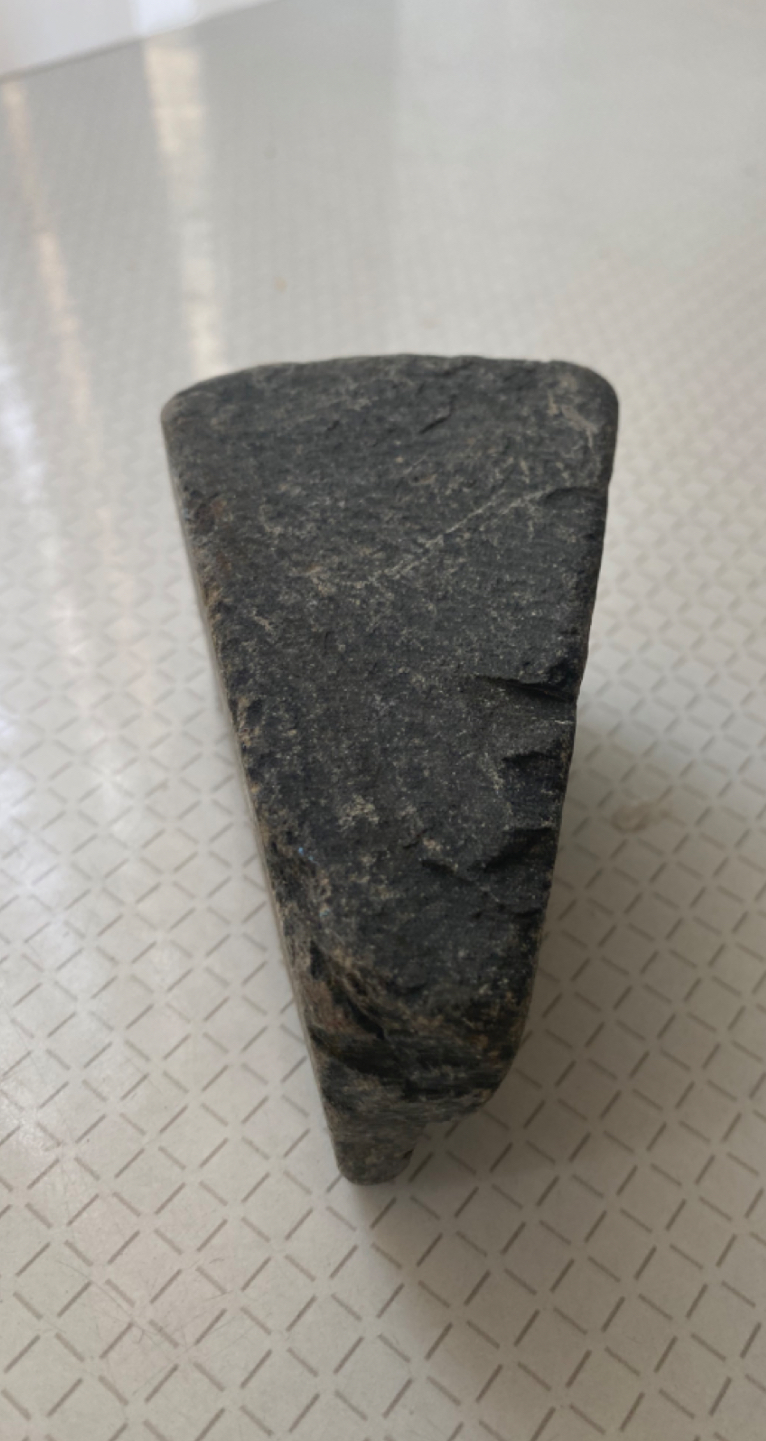 رنگ سنگ خاکستری-طوسی یکنواخت با بافت دانهریز و طبیعی. این سنگ از نوع دگرگونی (احتمالاً اسلیت یا هورنفلس) است که بهطور طبیعی تحت فشار و دمای بالا شکل گرفته.